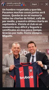 “Un hombre respetado y querido. Pasamos muchas cosas juntos en ocho meses. Quedarán en mi memoria todas las charlas de fútbol, café de por medio, y nuestra última charla en septiembre. Viniste al club en un momento muy difícil y llegaste a semifinales en muy poco tiempo. Gracias por todo. Hasta siempre, Miguelo”, escribió Moretti en una historia de Instagram, acompañada por una foto del técnico en su presentación.