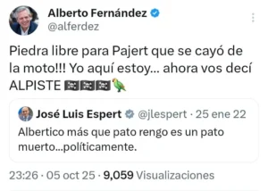 “Piedra libre para Pajert que se cayó de la moto!!! Yo aquí estoy… ahora vos decí ALPISTE”, sentenció Fernández en un mensaje que rápidamente se volvió viral.